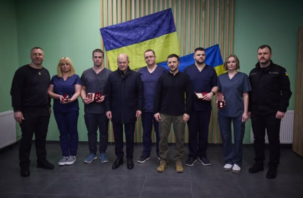 Президент Володимир Зеленський і Федеральний канцлер Німеччини Олаф Шольц, який приїхав до України з візитом, відвідали в Києві поранених військових.