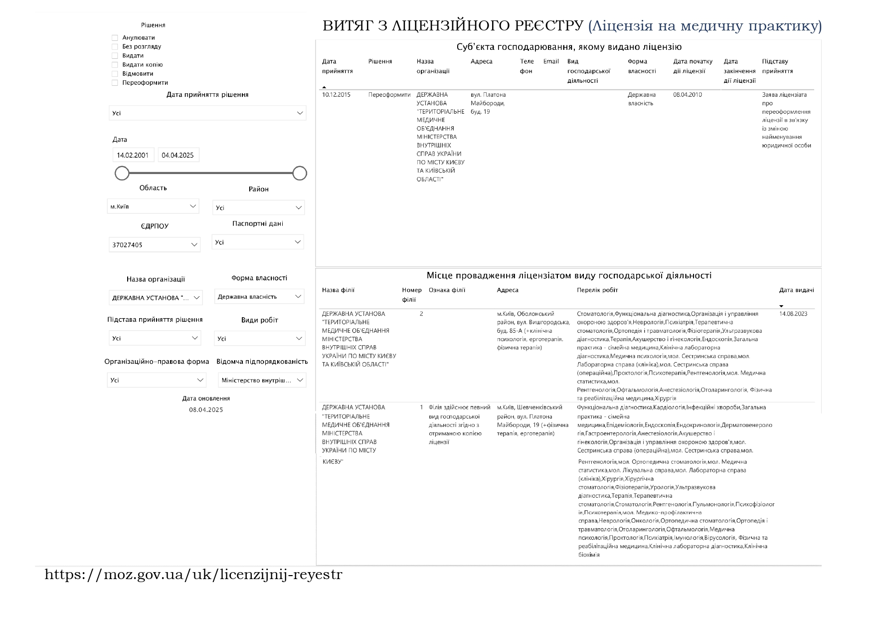 Департамент охорони здоров'я МВС України Міністерство внутрішніх справ України Міністерство охорони здоров'я України Урядовий портал Верховна Рада Офіс Президента