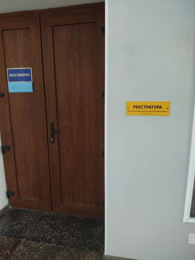 З лівого боку біля головного входу, на висоті 0,95 м, встановлено помітну кнопку виклику персоналу. Додатково розміщена інформаційна табличка, продубльована шрифтом Брайля. Краї входу позначені контрастною жовтою смугою шириною 3–5 см із неслизького матеріалу, а також облаштовані тактильною плиткою з рельєфною поверхнею.