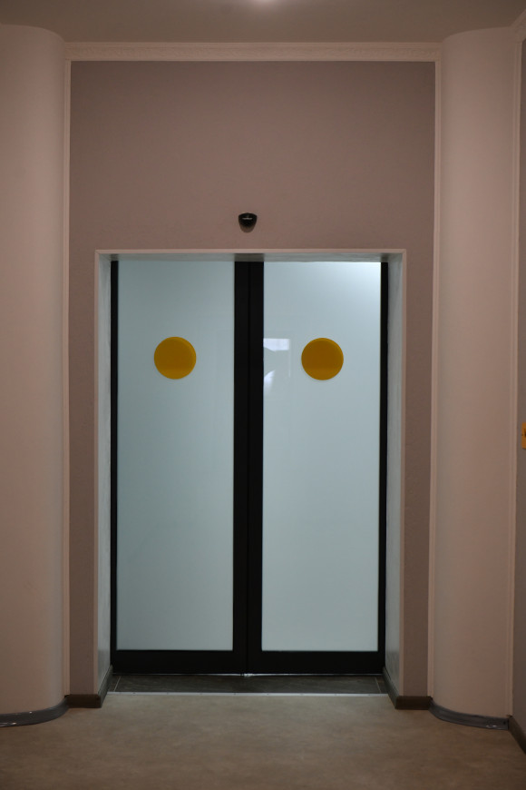 Для запобігання зіткненню з прозорими конструкціями усі двері в будівлі мають елементи візуального контрасту, що покращують орієнтування для осіб з порушеннями зору