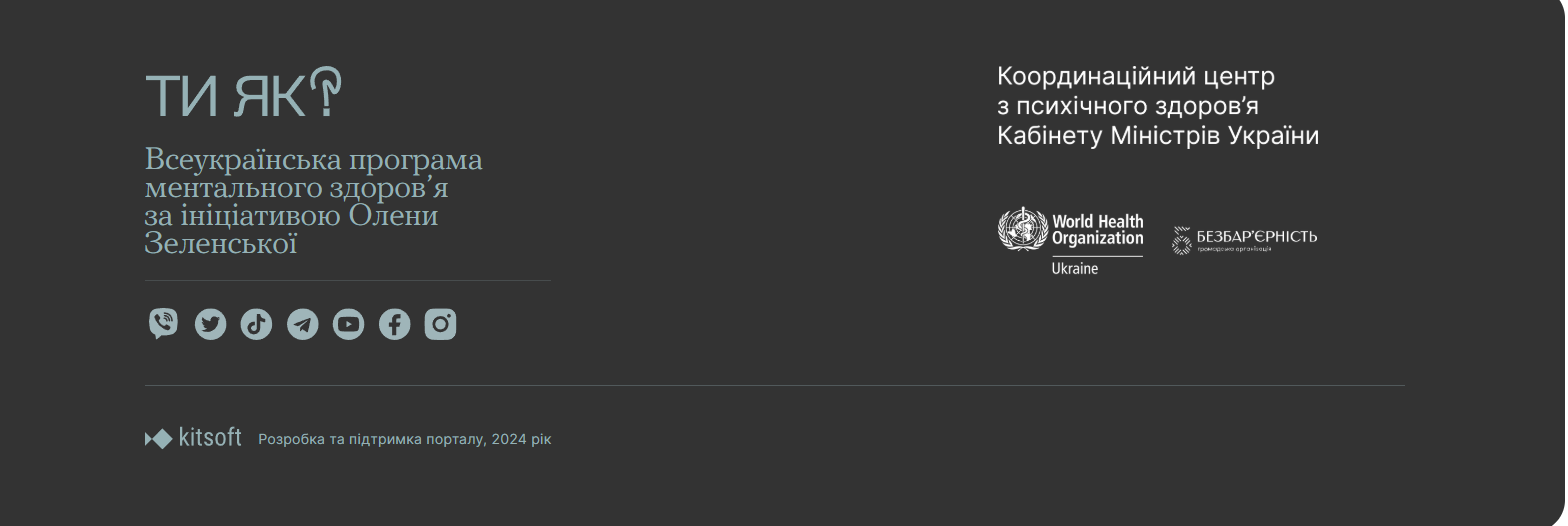 Інфобокс створений у межах Всеукраїнської програми ментального здоров’я «Ти як?» — ініціативи першої леді Олени Зеленської, у співпраці з DIGNITY — Данським інститутом з протидії катуванням, за фінансування Міністерства закордонних справ Данії. Експертна та аналітична підтримка — Координаційний центр з психічного здоров’я Кабінету Міністрів України, управління реінтеграційних заходів Центрального управління цивільно-військового співробітництва Генерального штабу Збройних Сил України, Міністерство у справах ветеранів. Медіапартнер — Starlight Media. Технічна підтримка — ГО «Безбар’єрність».