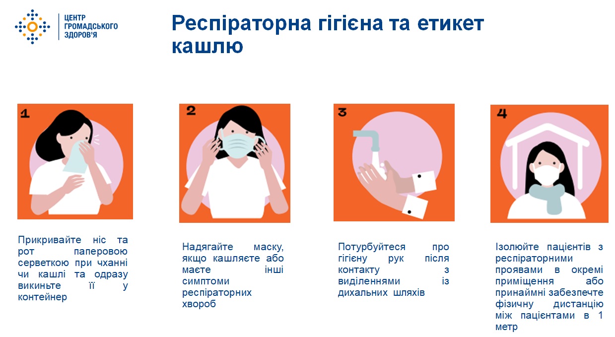 етикету кашлю та респіраторної гігієни;