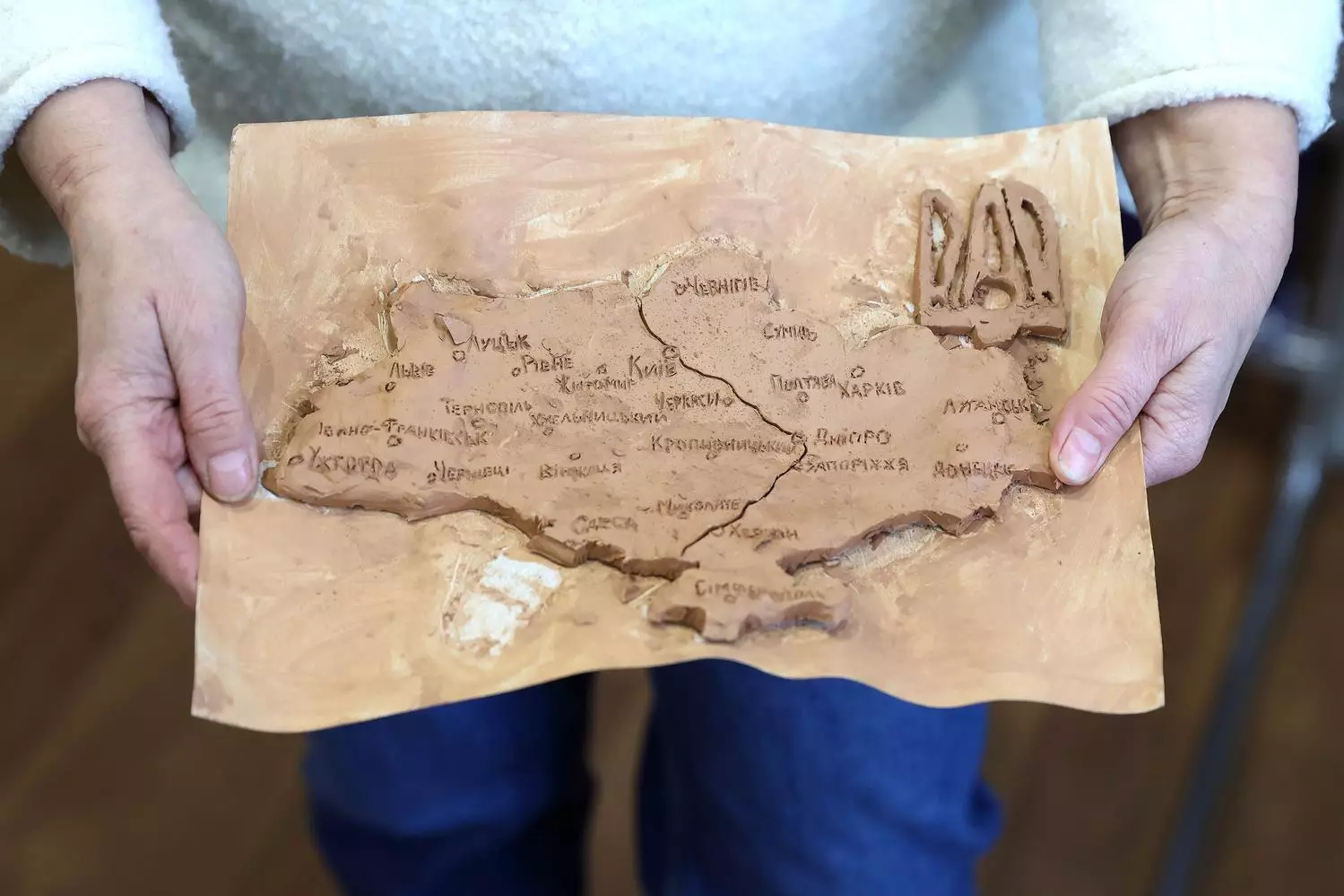 «Першими тут з’явилися роботи з глини. Глина - дуже терапевтичний матеріал. Ось, наприклад, ця карта України з цегли - її створив боєць, якого визволили з російського полону. Це була робота на тему “Відтвори свій настрій”. І він відтворив Україну - кожне місце, кожен фрагмент», - розповідає майстриня.