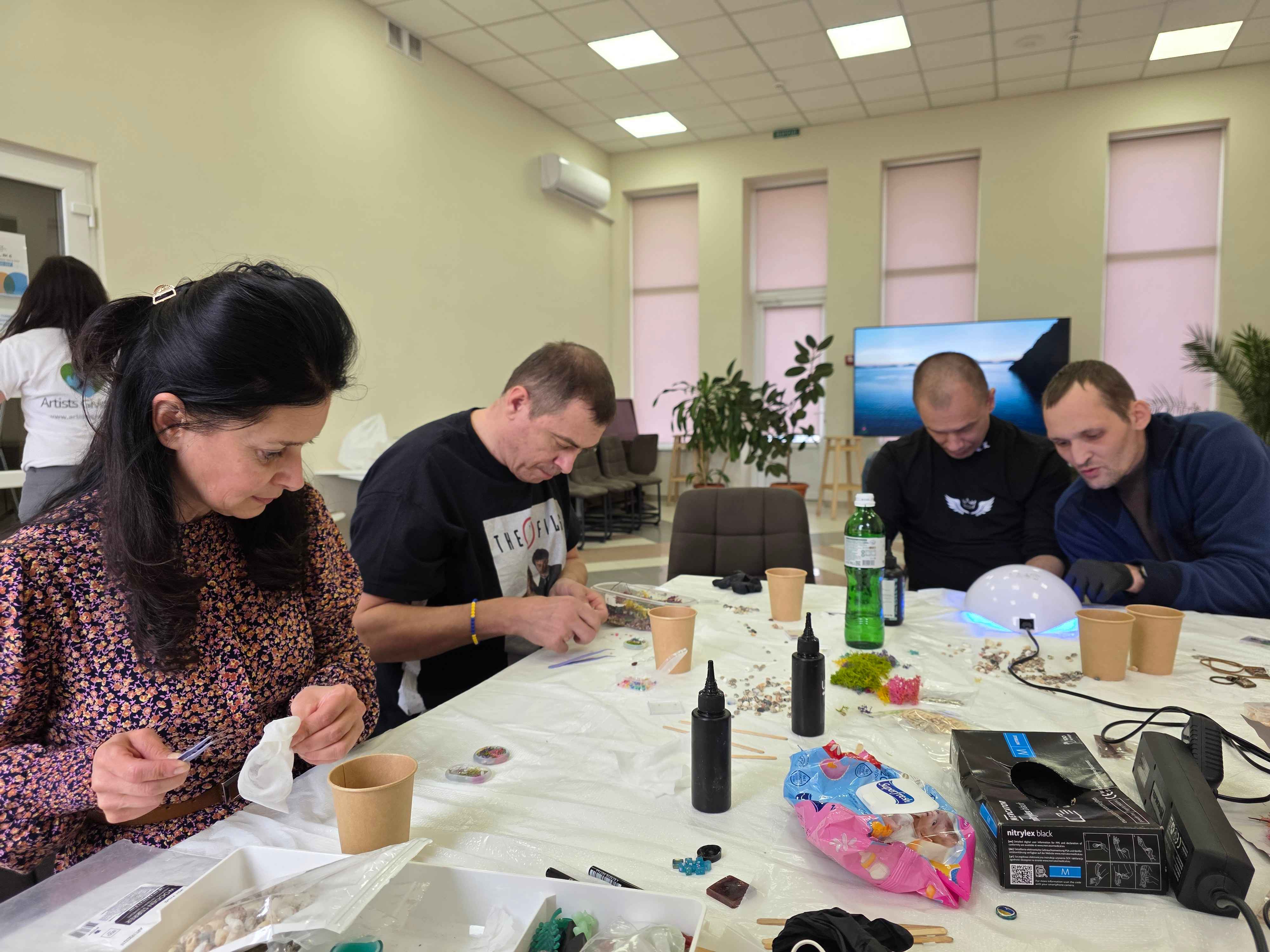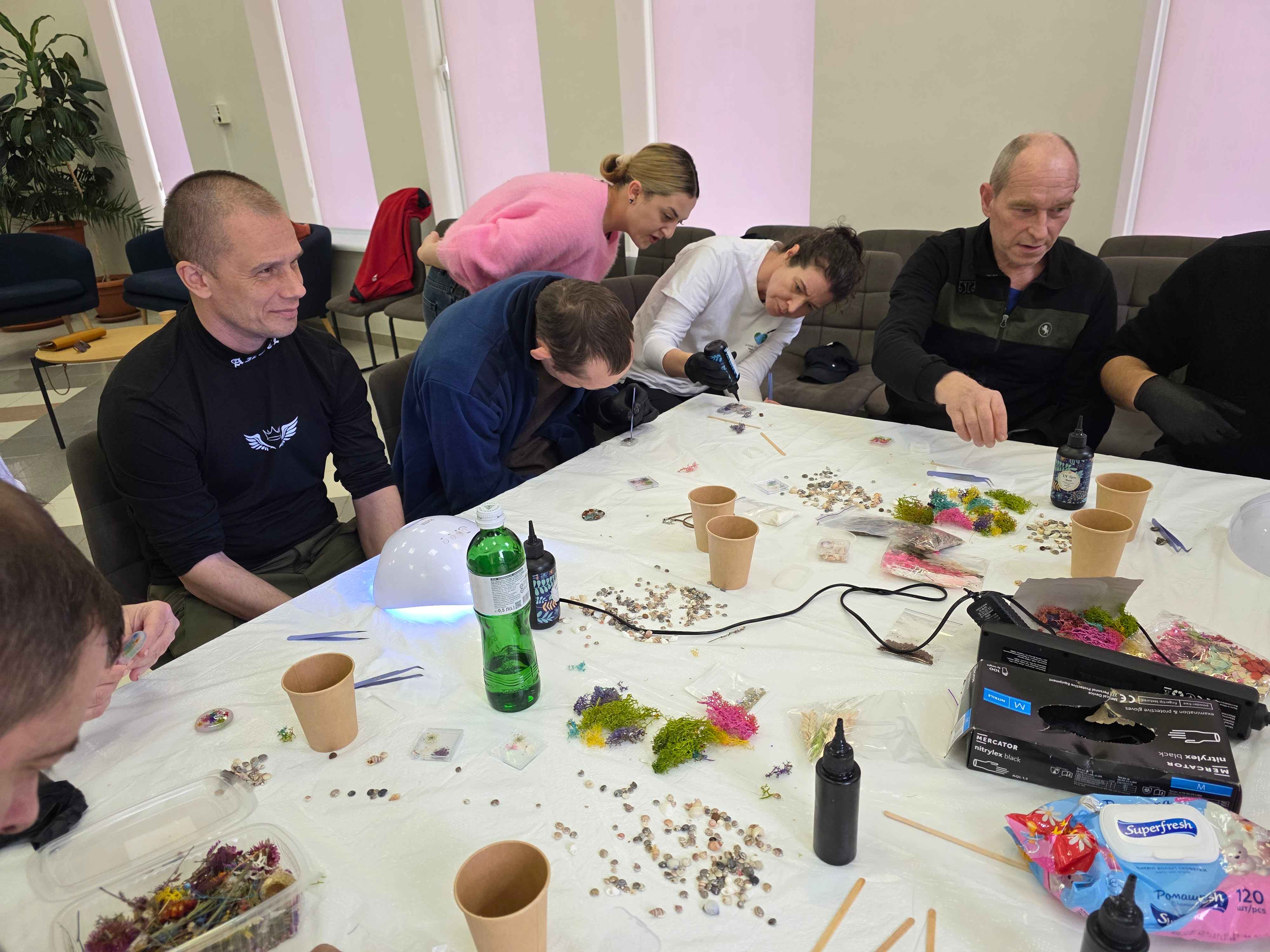 Наші захисники, які проходять лікування та реабілітацію у ДУ «ТМО МВС України по Закарпатській області», вже неодноразово долучалися до різних заходів, терапій та активностей, що дарують їм сили, підтримку й нові можливості для самовираження. Чергове заняття арт-терапії стало для них нагодою спробувати себе у роботі з епоксидною смолою, створюючи власні вироби — від декоративних елементів до невеликих прикрас.