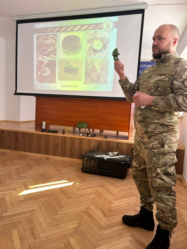 Учасникам заходу продемонстрували різні види вибухонебезпечних предметів, боєприпасів та пристроїв, які можуть траплятися на території України, а також пояснили, на які ознаки необхідно звертати увагу. Фахівець підкреслив, що необережне поводження з такими знахідками може призвести до тяжких травм або загибелі людей, тому надзвичайно важливо вміти розпізнавати потенційну небезпеку та діяти відповідно до встановлених правил безпеки.