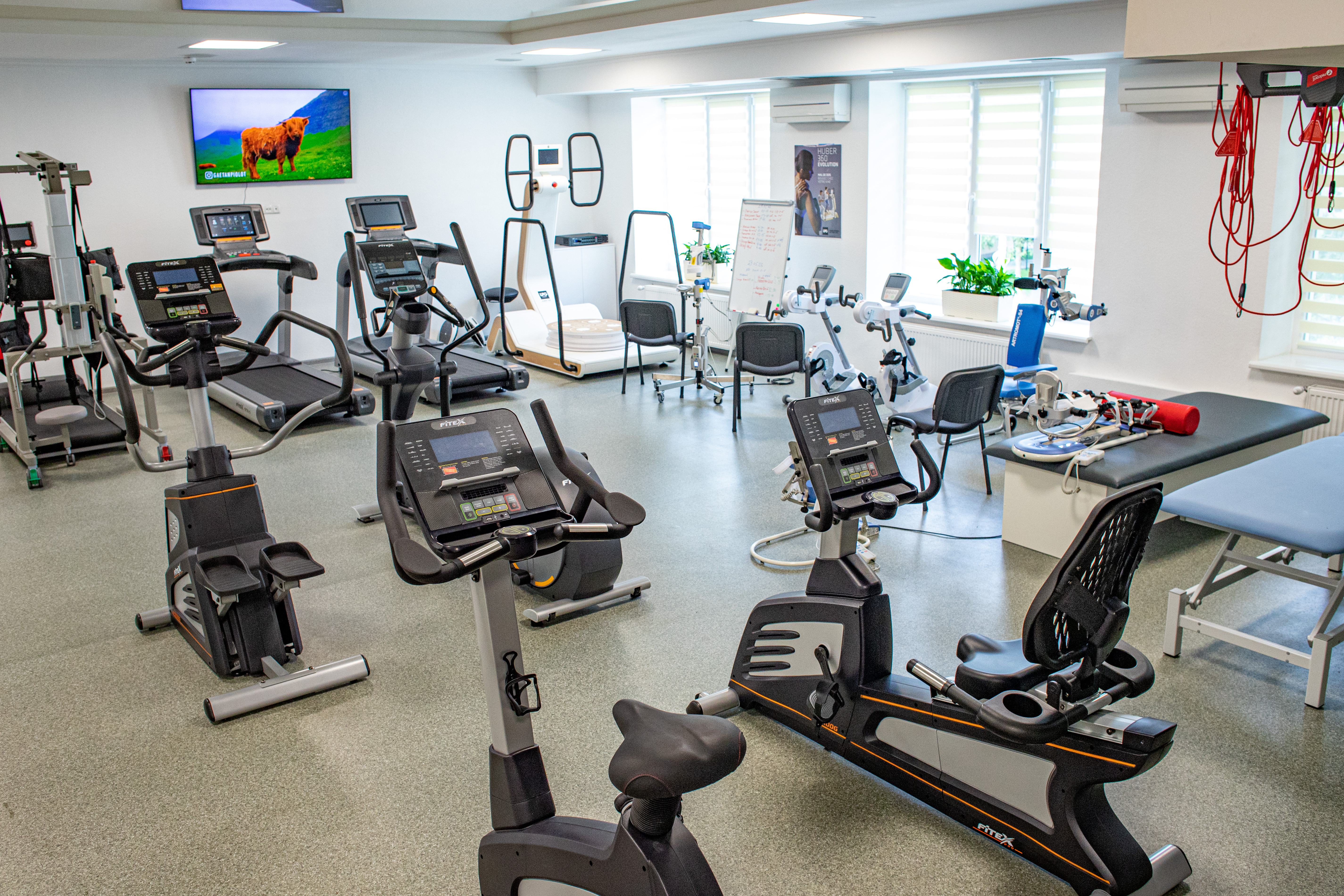 Наші пацієнти можуть відвідати у свій вільний час спортзал, оснащений сучасними силовими тренажерами, біговими доріжками, велотренажерами, орбітреками, гантелями та необхідним інвентарем для занять фітнесом. Заняття на тренажерах проходять під наглядом тренера, який коригує навантаження та слідкує за кожним відвідувачем. Заняття в нашому спортзалі стануть незамінною річчю для підтримки гарної фізичної форми, особливо важливі для тих, хто веде малорухливий спосіб життя і має сидячу роботу.