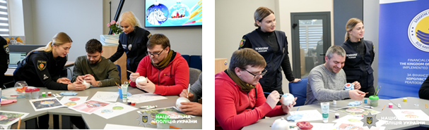 Захід став простором тепла, затишку та щирої підтримки, що так важливо для відновлення внутрішнього стану після пережитих випробувань. Так, у просторі соціально-психологічної підтримки «Блакитне небо для України» бійці створювали унікальні ялинкові прикраси, вкладаючи у кожну кульку власні емоції та мрії. Дехто з поранених обирав елементи, пов’язані з образом Коня — символом прийдешнього 2026 року. Ці риси надзвичайно відгукуються нашим поліцейським, адже саме наполегливість, воля та незламність допомагають їм рухатися вперед. Творчий процес допоміг зменшити напругу, сприяв емоційному розвантаженню та додав відчуття свята. А власноруч створені прикраси стануть не лише окрасою ялинки, ай маленькими талісманами наступного року, сповненими сили та надії. Зустріч відбулася в межах Всеукраїнської програми ментального здоров’я «Ти_як?» та проєкту «Пункт психологічних практик» МВС.