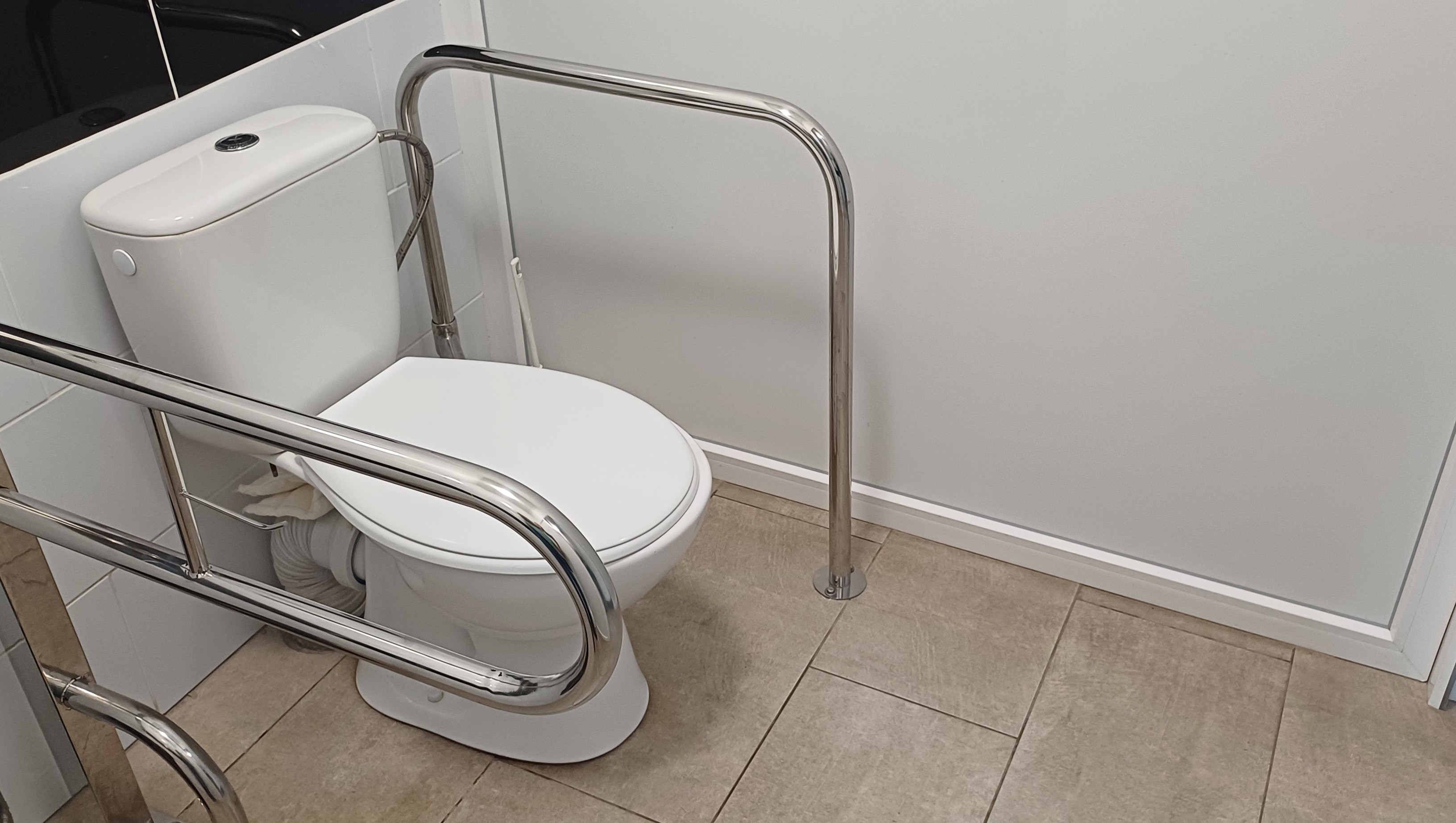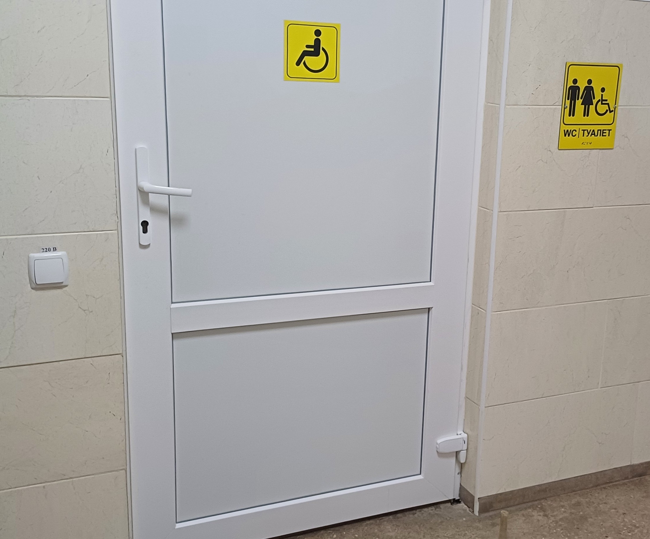 - облаштовані вбиральні на першому та другому поверхах лікарні, які мають кабінки для людей з інвалідністю і позначені спеціальними знаками;