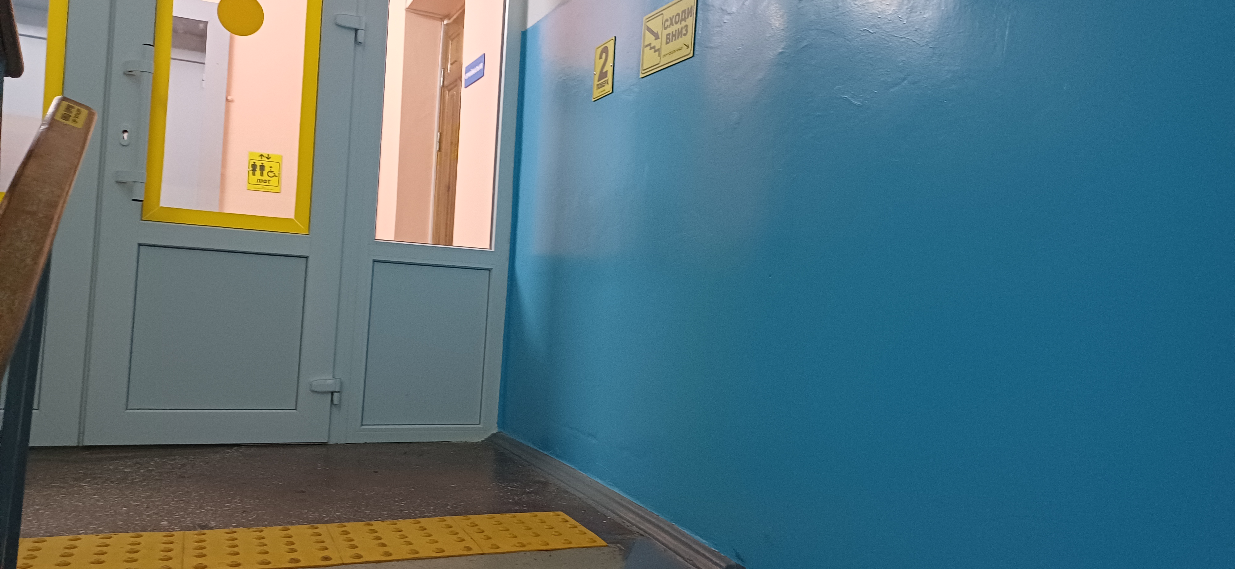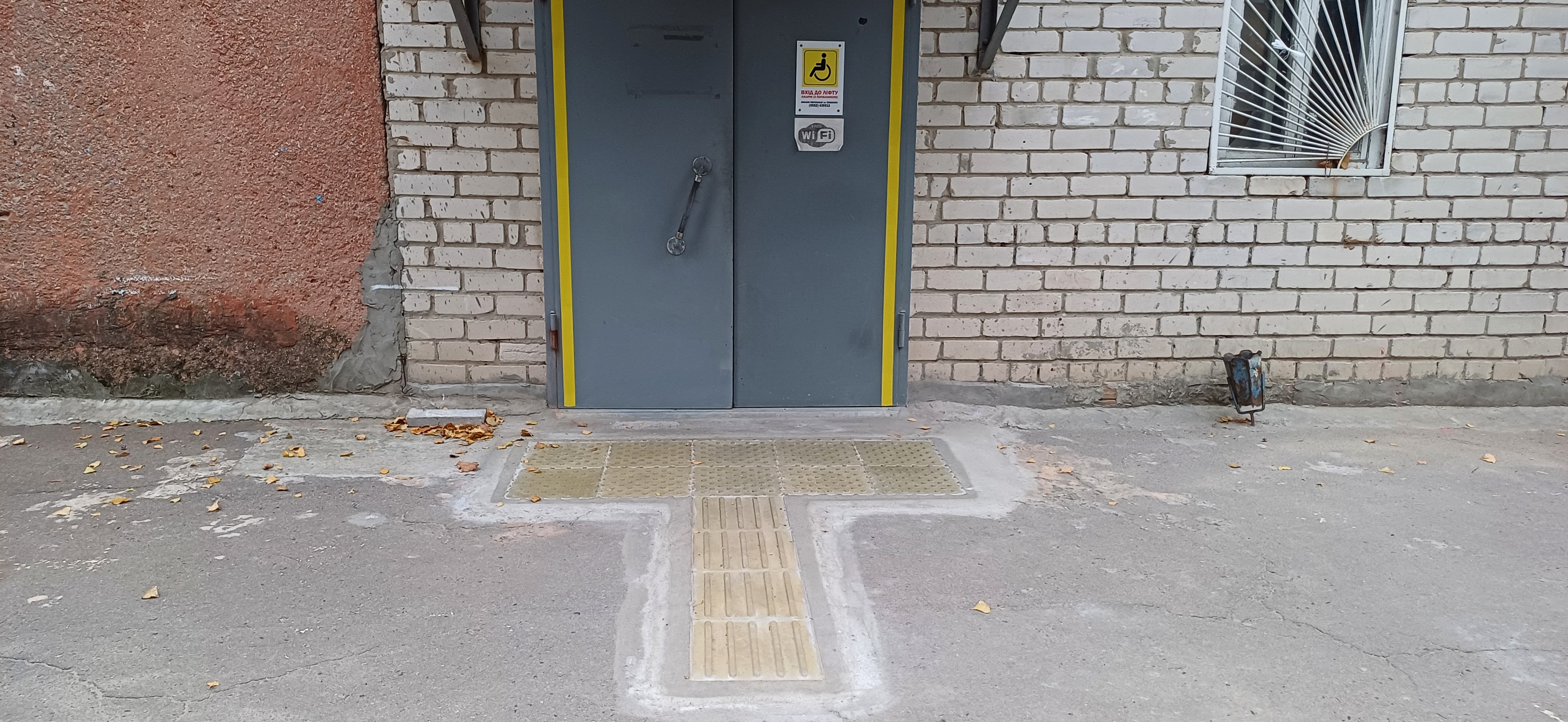 - позначено спеціальним знаком із номером телефону для виклику чергового запасний вихід будівлі, який має візок та понижені пороги;