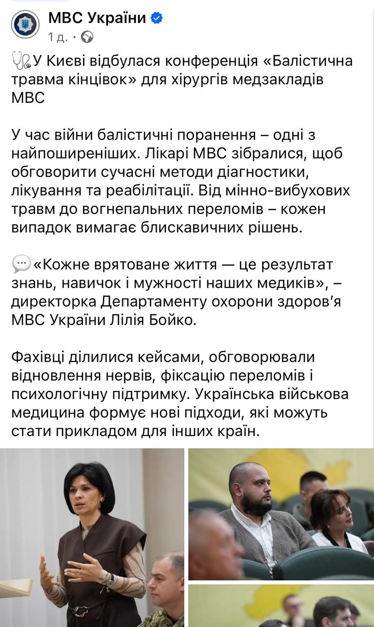 Лікарі ДУ «ТМО МВС України по Хмельницькій області», а саме: хірург Кукурудза Ілля Володимирович та травматолог Левчук Наталія Володимирівна також відвідали конференцію «Балістична травма кінцівок» у м. Київ. Вдячні Департаменту охорони здоровʼя МВС України за організований захід для фахівців зі всієї України, за отримані цінні знання та актуальні навички в роботі із пораненими пацієнтами.