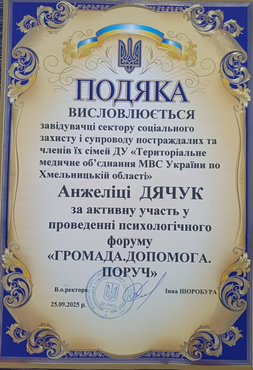 25 вересня у місті Хмельницький відбувся Всеукраїнський психологічний форум «ГРОМАДА. ДОПОМОГА. ПОРУЧ» для психологів, психотерапевтів, соціальних працівників та фахівців із соціального супроводу.