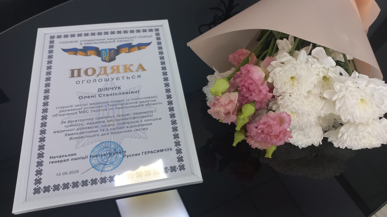 З нагоди Дня медичної сестри відбулася святкова нарада, на якій були вручені подяки від керівництва ГУНП в Хмельницькій області та керівництва ДУ «ТМО МВС України по Хмельницькій області» за багаторічну сумлінну працю, доброзичливість і чуйність, старанність у наданні висококваліфікованої медичної допомоги.
