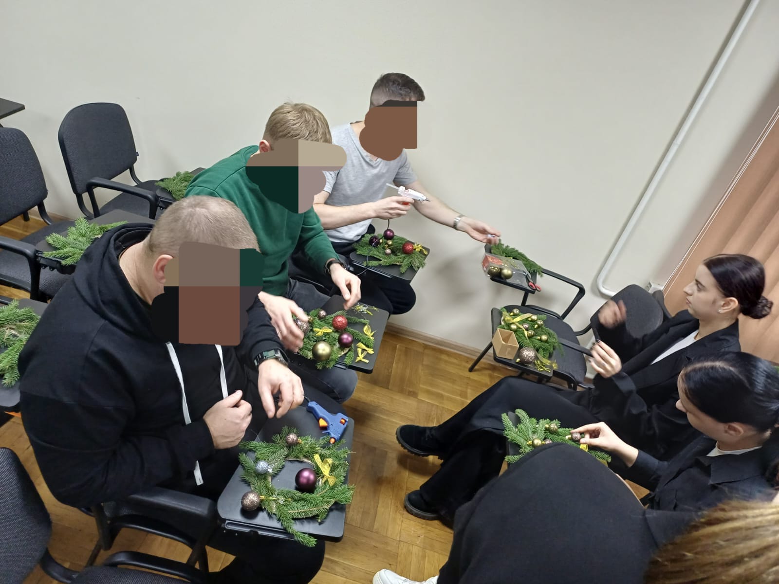 До поранених, які проходять лікування у ДУ «ТМО МВС України по Хмельницькій області», завітали курсанти Харківського національного університету внутрішніх справ. Майбутні правоохоронці привезли із собою новорічний настрій та провели творчу зустріч із військовослужбовцями, під час якої разом виготовляли різдвяно-новорічні прикраси.