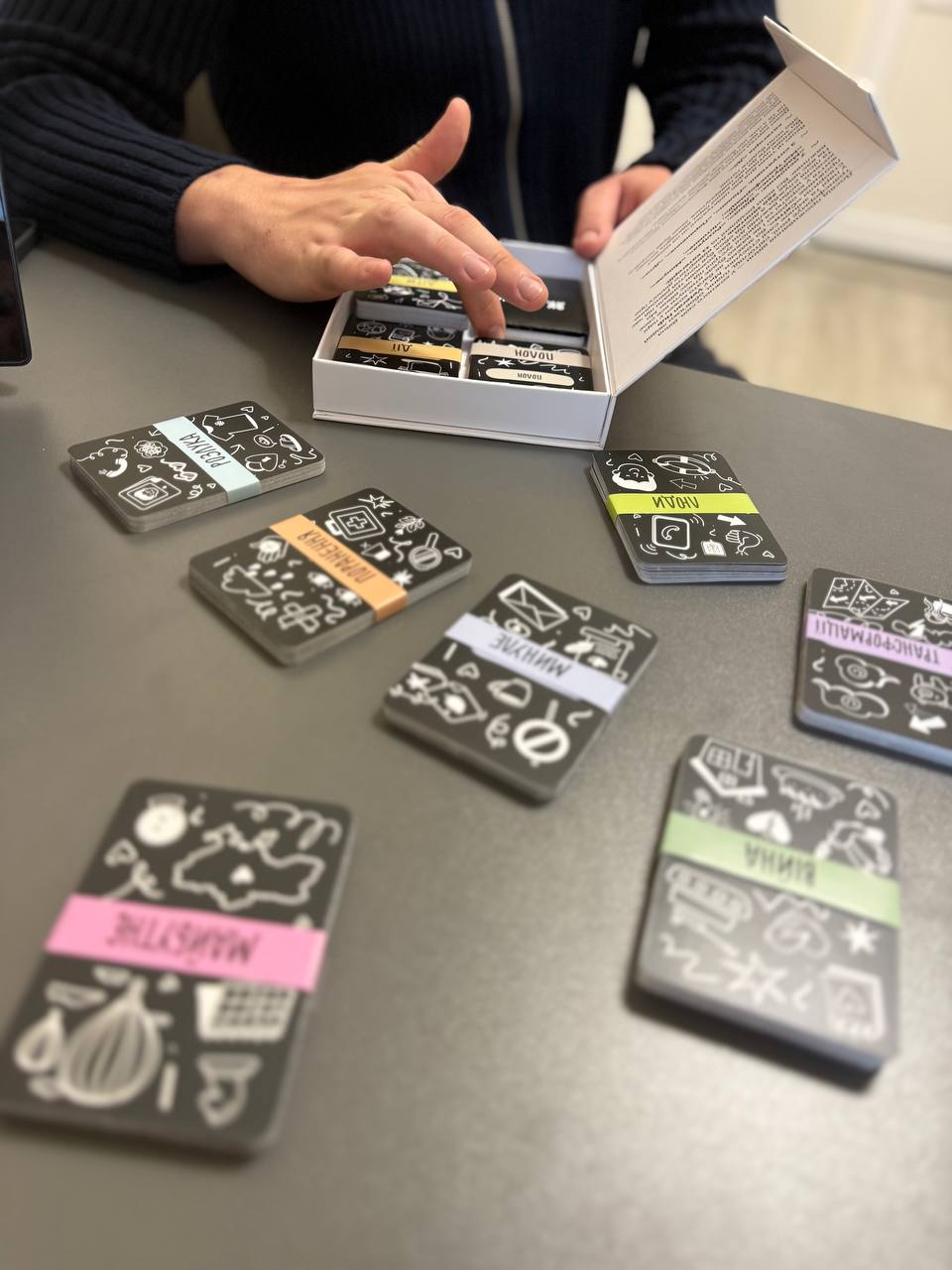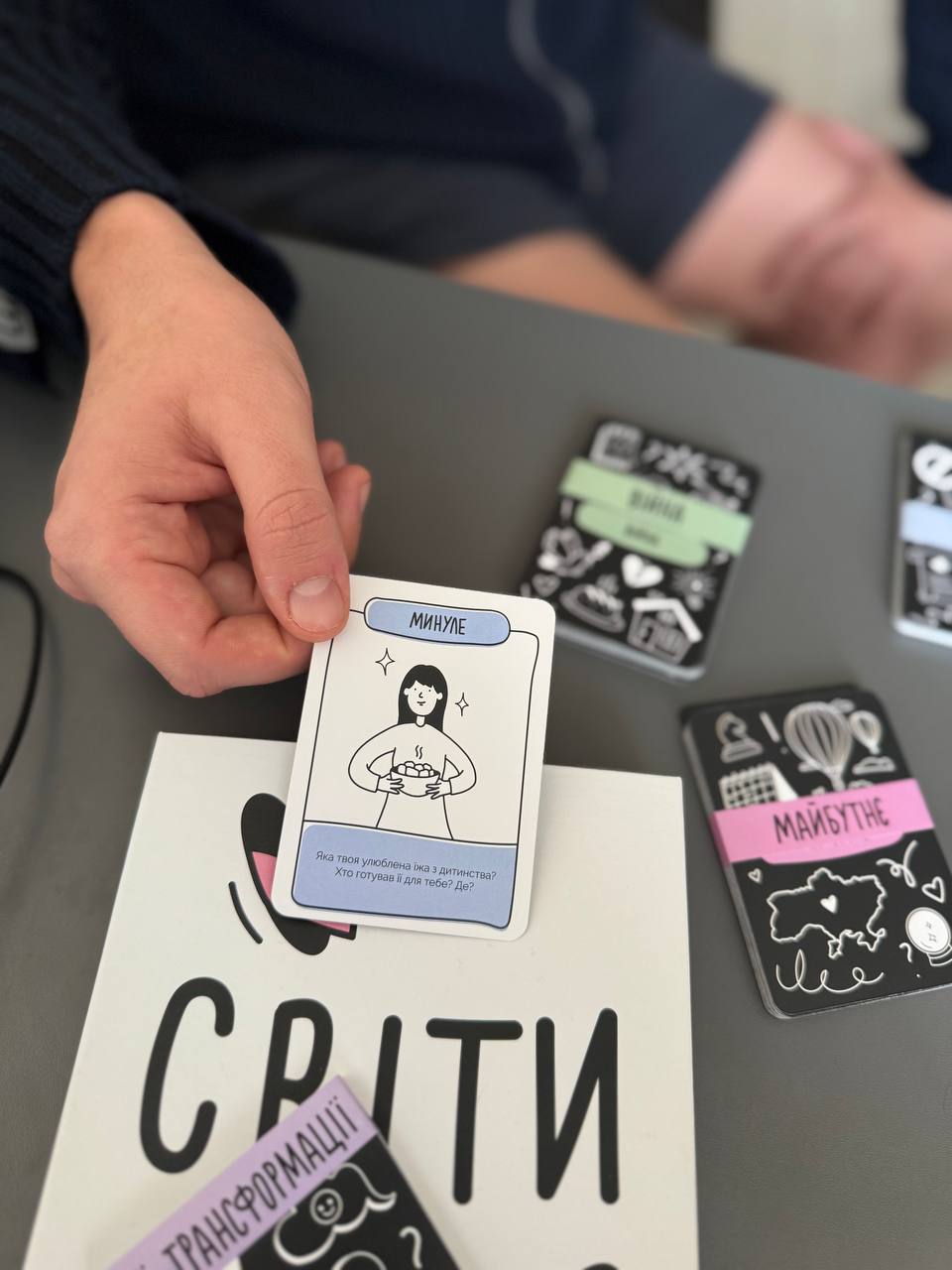 Карткова гра «Світи» допомагає розпочати діалог у парах військових та їхніх коханих про важливі, втім часто непроговорені теми — досвід переживання війни, стосунки на відстані, глибинні почуття та особистісні трансформації.