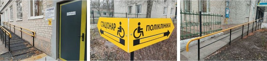 Люди з інвалідністю можуть потрапити до будівлі поліклініки через головний вхід по вул. Героїв-рятувальників, 3, а також з внутрішнього подвір’я до приймального відділення стаціонару. При вході в будівлю поліклініки є сходи. Зліва від будівлі є пандус з поручнями.