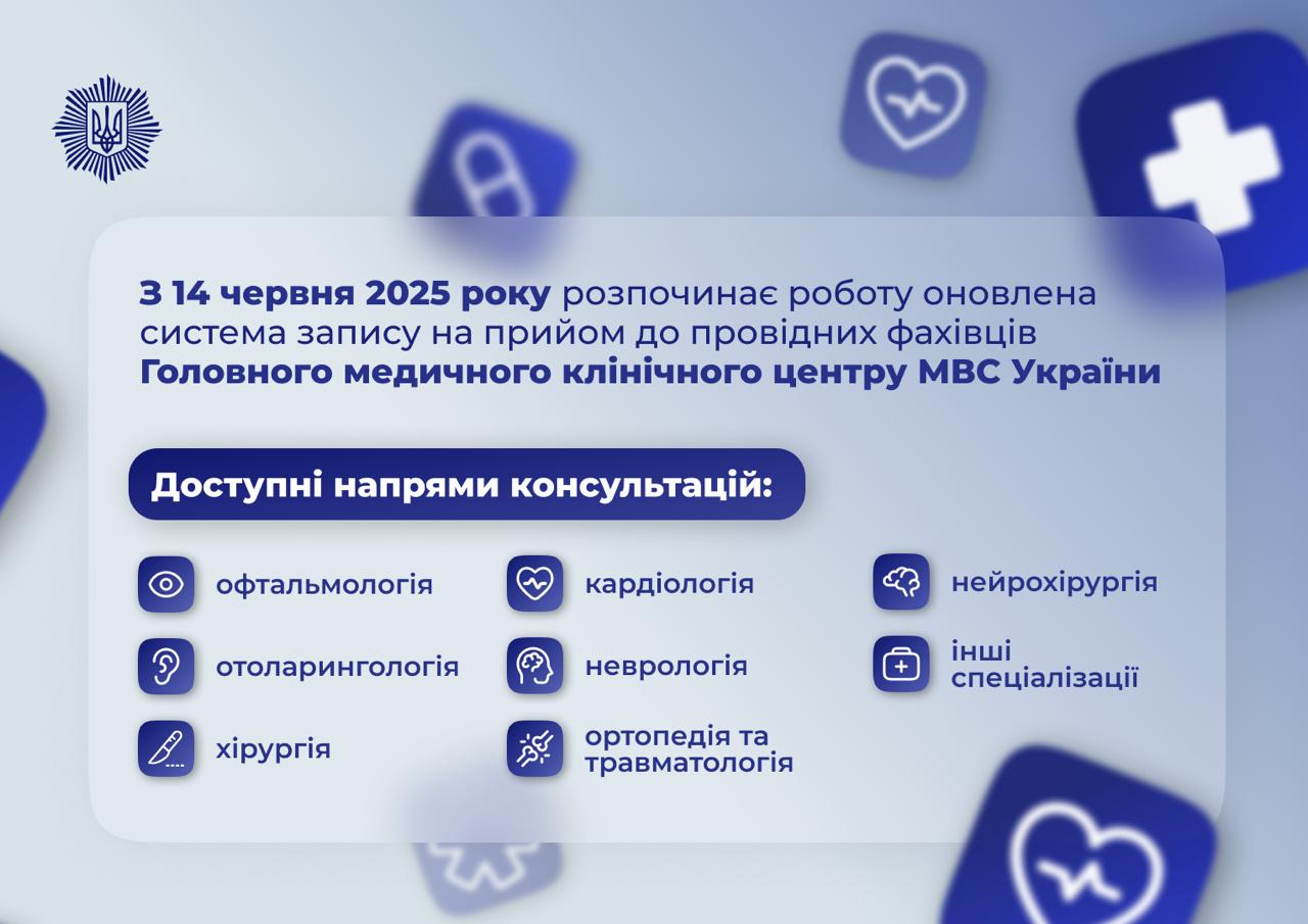 З 14 червня розпочинає роботу оновлена система запису на прийом до лікаря. Консультації відбуватимуться на базі Головного медичного клінічного центру МВС.