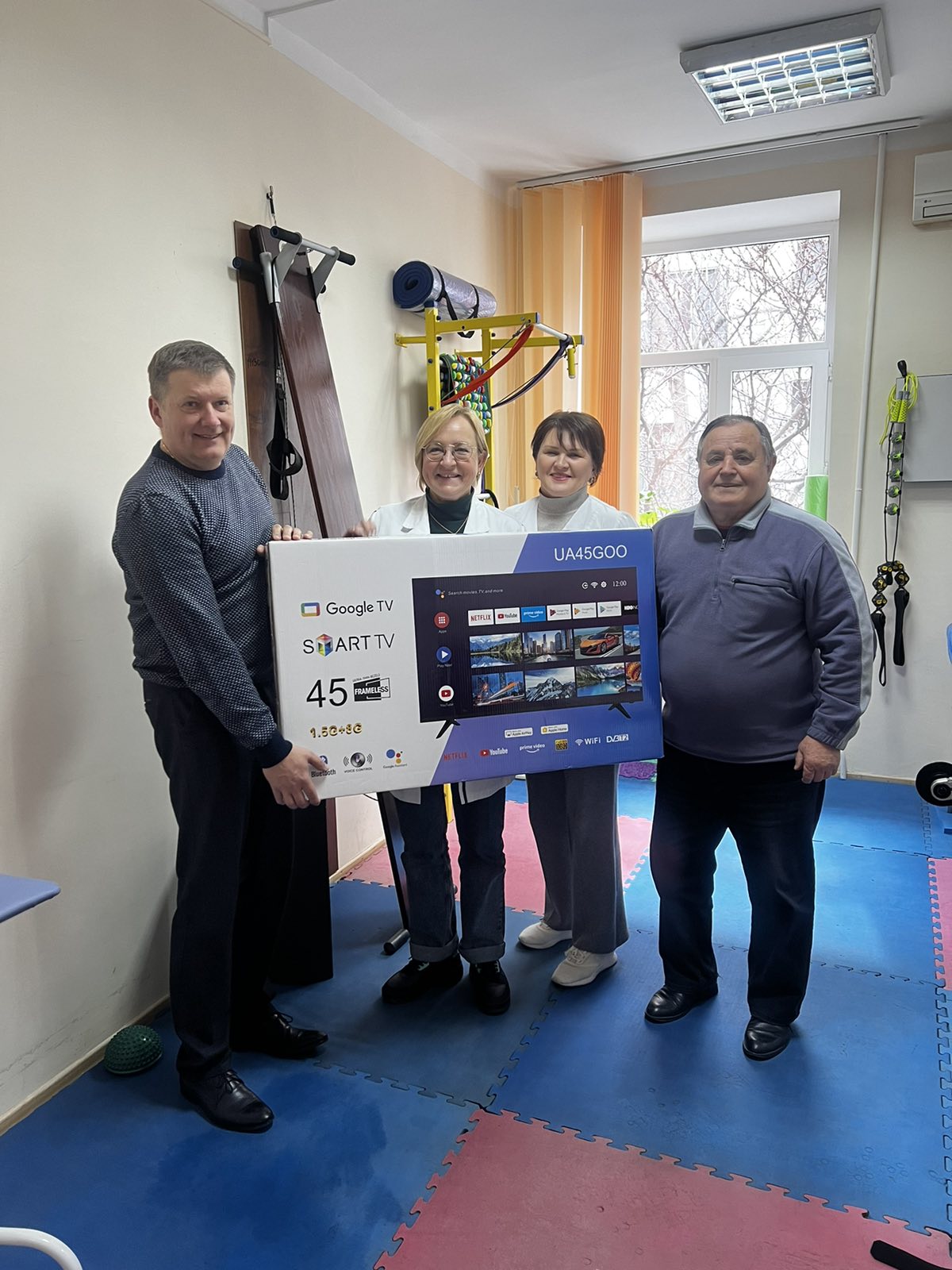 Для можливості надання висококваліфікованих послуг маломобільним групам населення, задля можливості відновлення функції верхніх кінцівок та реабілітації наших бійців для роботи реабілітаційного робота верхніх кінцівок А2-2, Одеським відділенням міжнародної громадської організації Української секції міжнародної поліцейської асоціації, Директором Константиновим Іваном Івановичем було придбано та вручено Smart-телевізор.