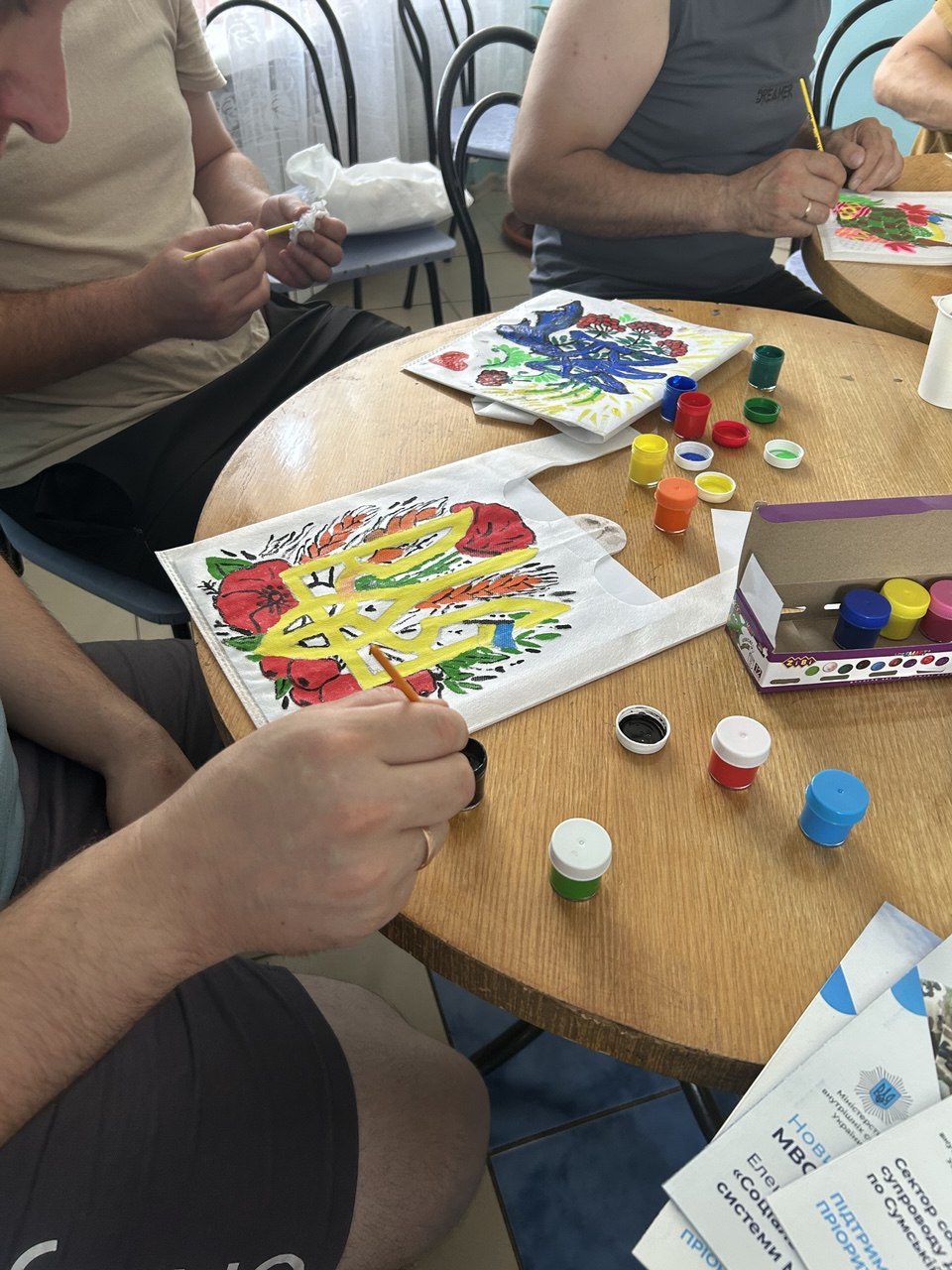 Сектором соціального захисту і супроводу постраждалих та членів їх сімей ДУ «Територіальне медичне об`єднання МВС України по Сумській області» разом з Центром Житєстійкості м.Суми організовано творчий захід для Захисників – арт-терапія малювання сумок.