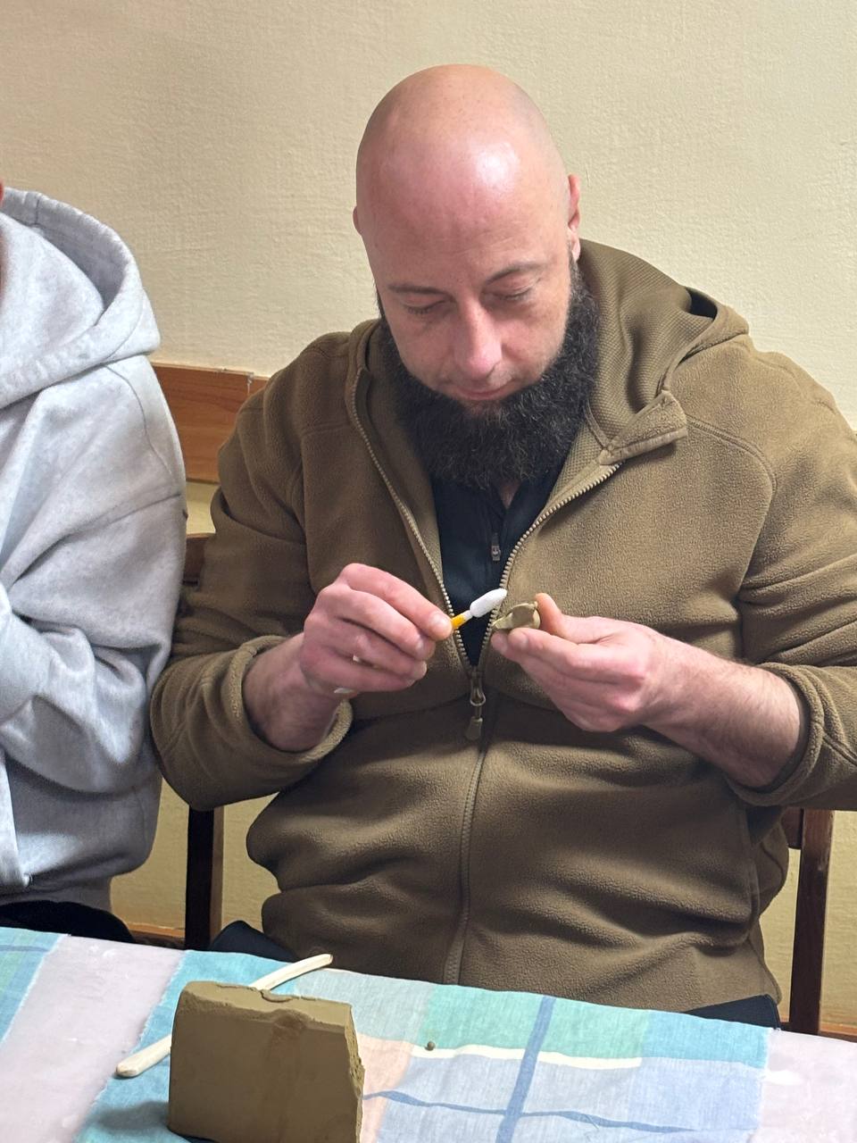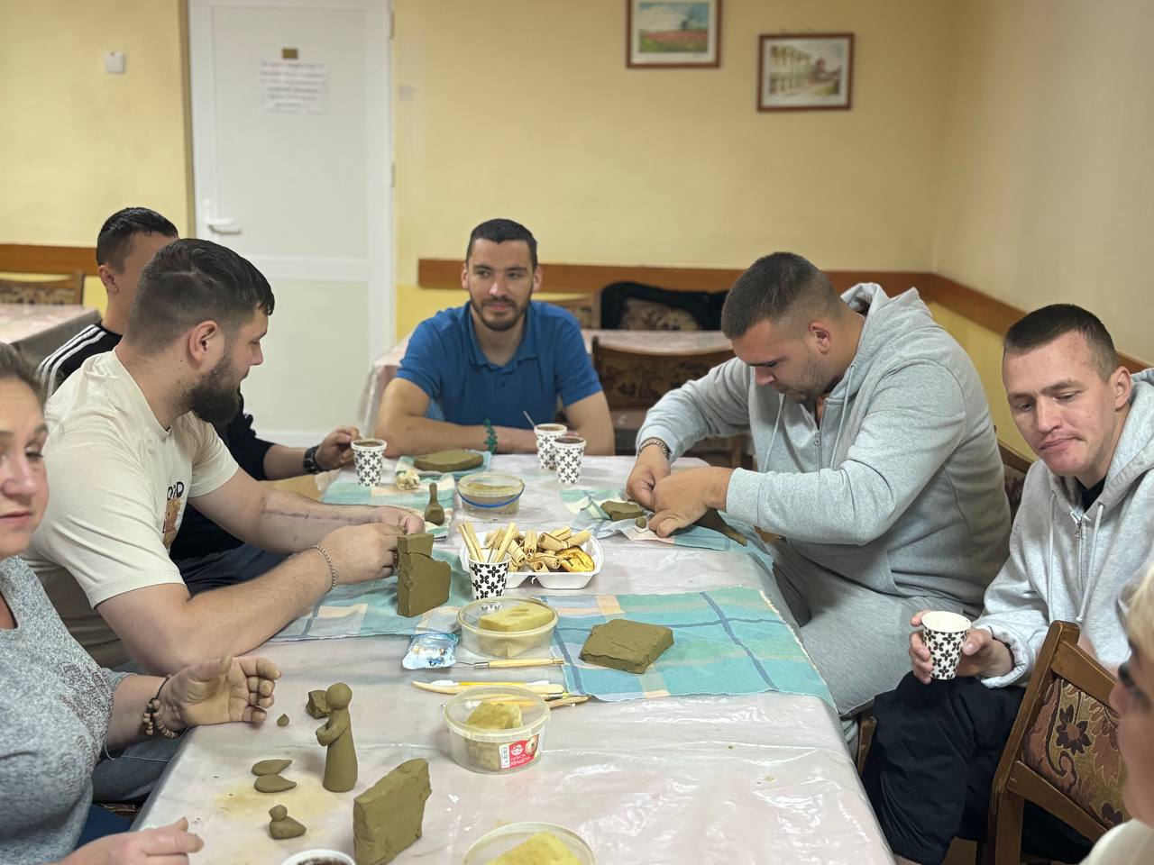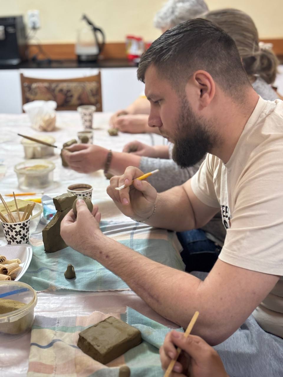 Глина – це не лише природний матеріал, а й засіб самовираження, що має потужний терапевтичний ефект. Під час заняття кожен учасник мав змогу власноруч створити виріб – від простого кухлика до декоративної фігурки – і, що найважливіше, зануритися у процес, який заспокоює, відволікає від болю і допомагає впоратися з емоційною напругою.