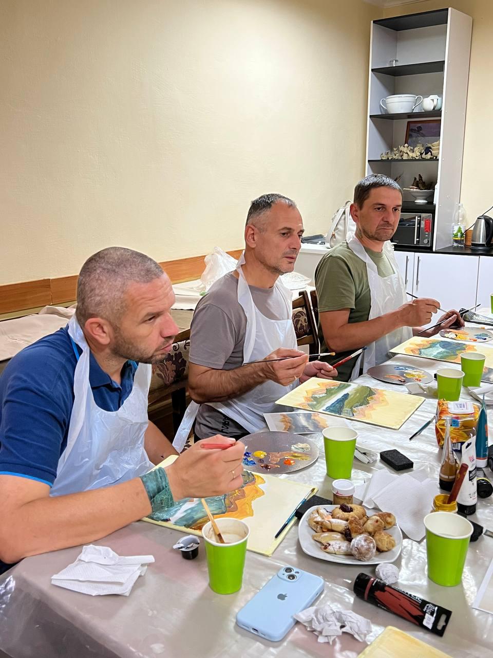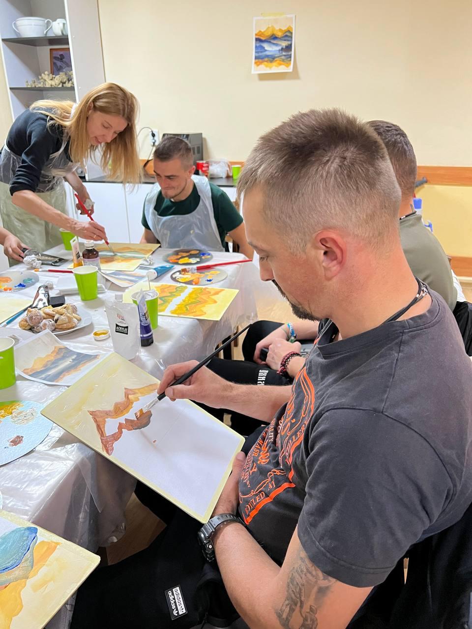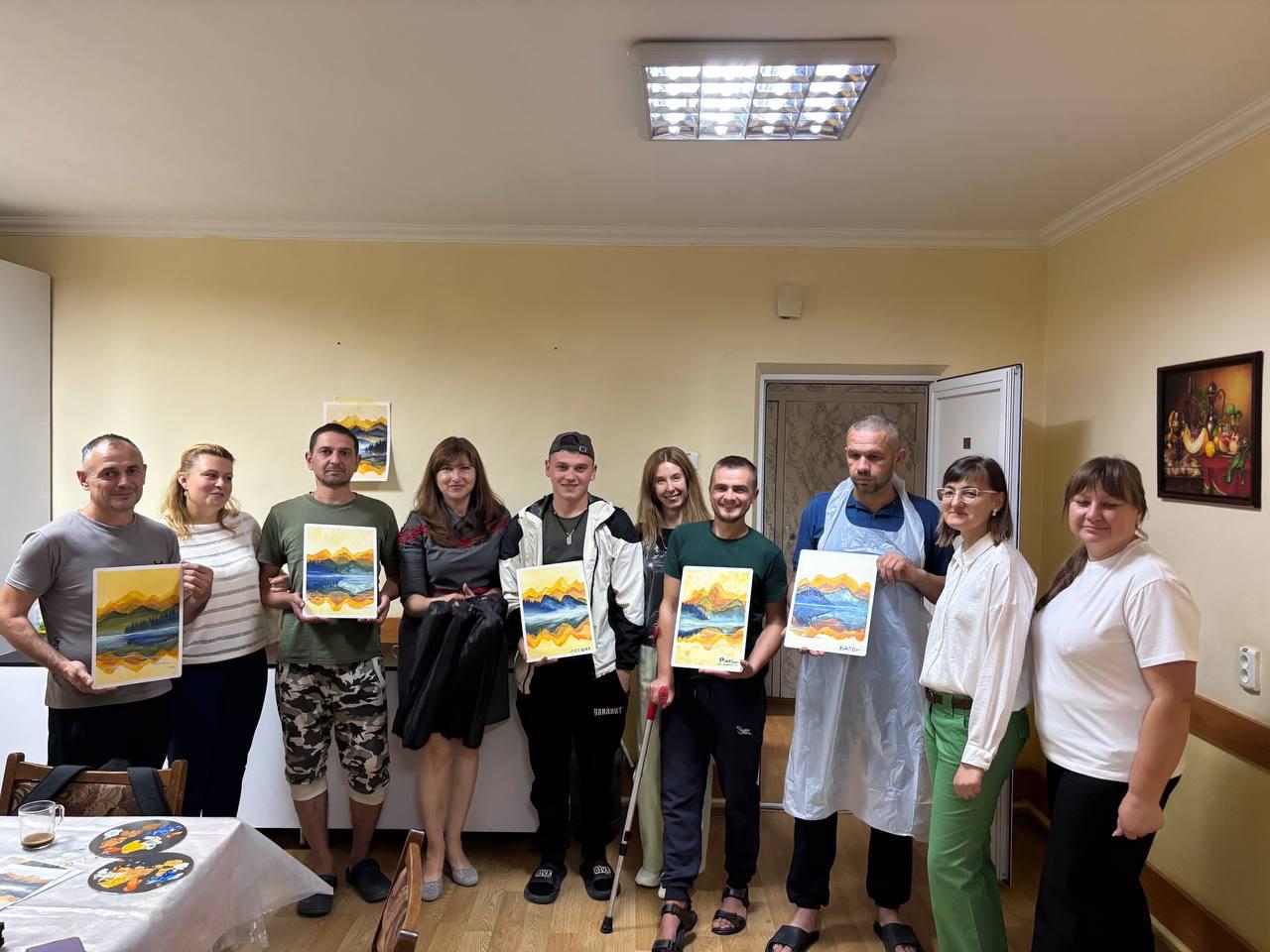 Темою заняття стало створення картин «В горах осінь», де учасники відобразили красу українських гір, барви золотої осені та власні емоції. У процесі малювання військовослужбовцям та правоохоронцям допомагали учасниці творчого проєкту «Творці без меж» – Оксана Мартинюк і Мар’яна Дячинська. Вони ділилися професійними порадами, підтримували кожного та сприяли тому, щоб роботи стали яскравим проявом внутрішнього світу авторів. Такі арт-заняття мають важливе значення для реабілітації поранених, адже допомагають зняти психологічну напругу, відновити емоційний баланс і відчути натхнення. Малювання стало для учасників не лише способом самовираження, а й джерелом позитивних вражень та віри у власні сили.