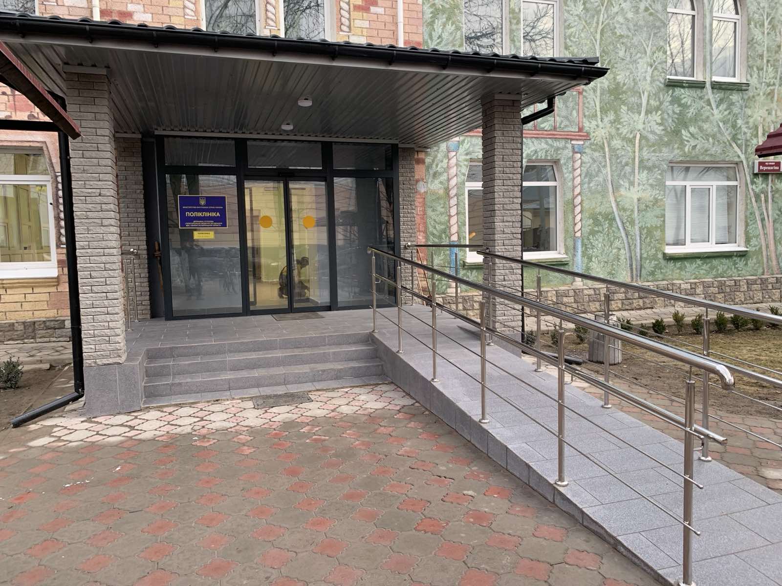 обладнано пандусом з поручнями вхід до лікарні та поліклініки, адаптовано вхідні двері для людей з інвалідністю;