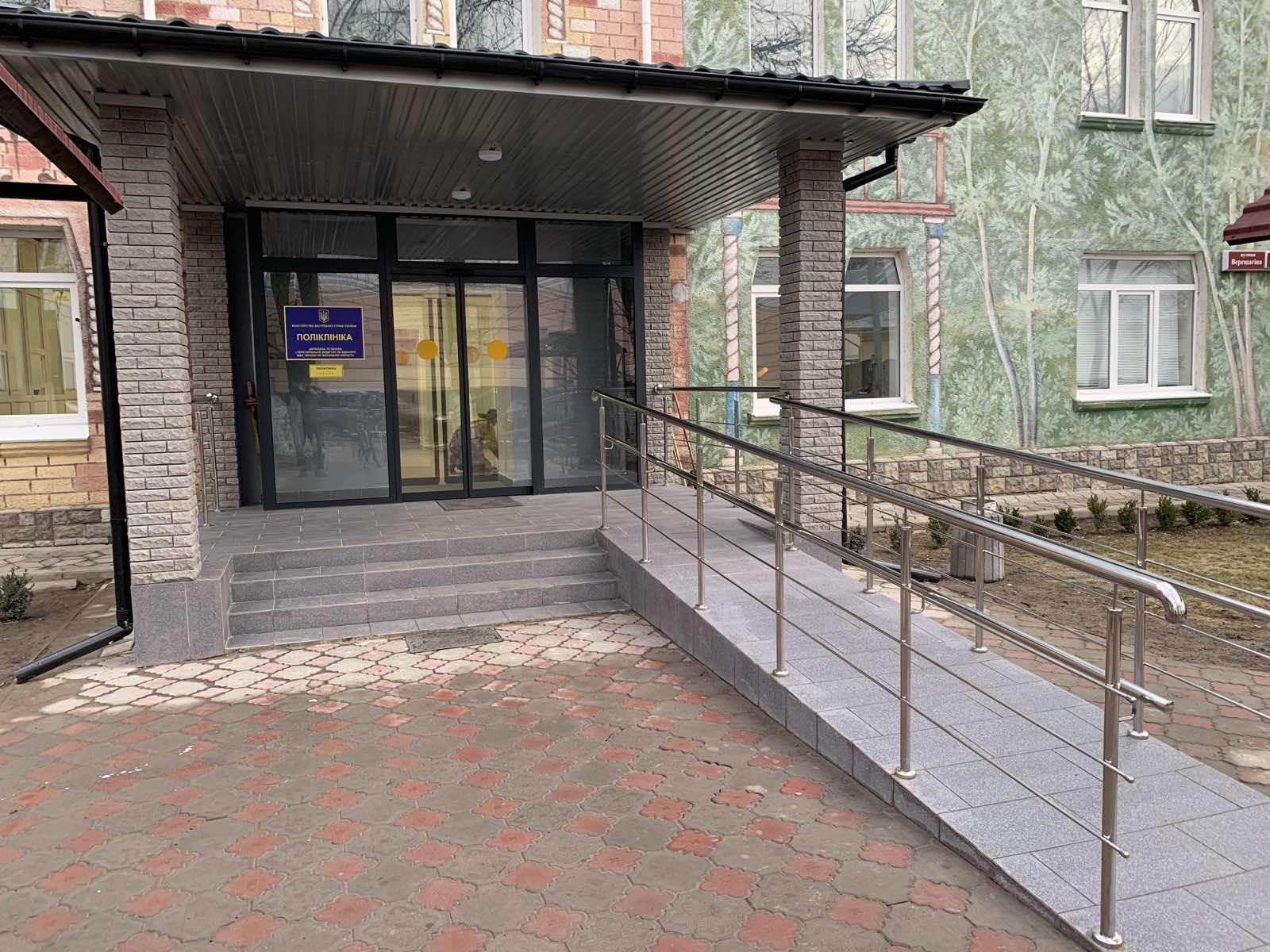 обладнано пандусом з поручнями вхід до лікарні та поліклініки, адаптовано вхідні двері для людей з інвалідністю;