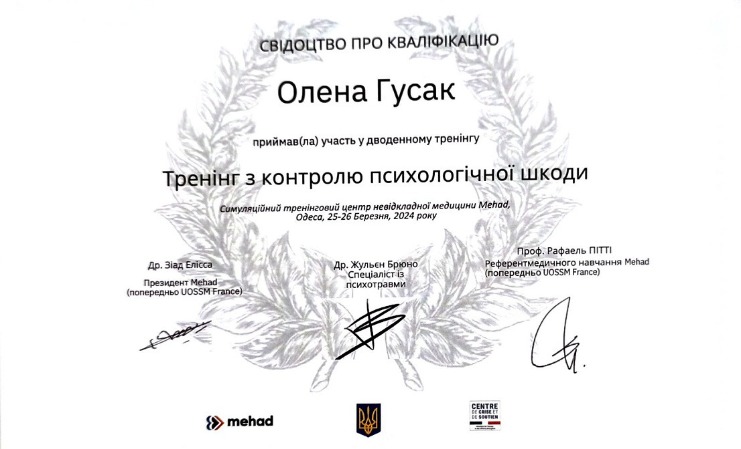 За співпрацею з МЕХАД, з метою набуття навичок роботи при поступленні пацієнтів до ЗОЗ після надзвичайних подій або на місці події, сестра медична терапевтичного відділення стаціонару ДУ "ТМО МВС України по Волинській області" Олена Гусак пройшла дводенний тренінг із психотравми в клініці Into Sana ( м.Одеса ) та отримала Свідоцтво про кваліфікацію "Тренінг з контролю психологічної шкоди". Учасники розглянули такі питання, як: