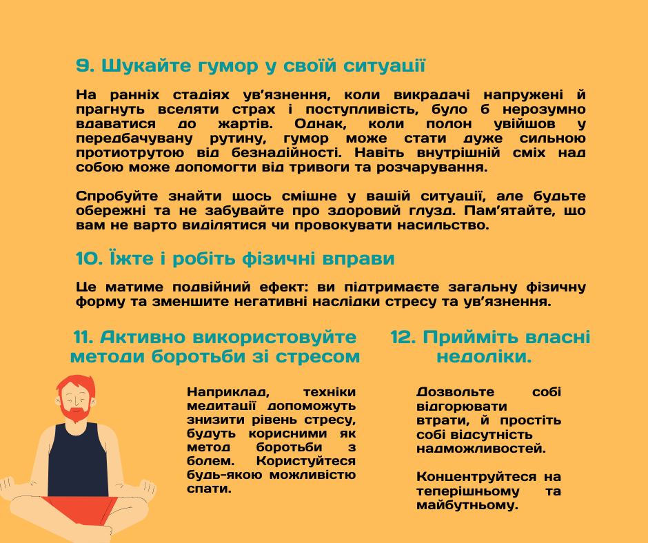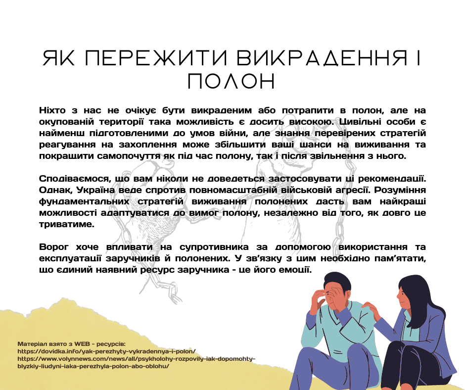 Сподіваємося, що вам ніколи не доведеться застосовувати ці рекомендації. Однак, Україна веде спротив повномасштабній військовій агресії. І в цих умовах ми просто не можемо стояти осторонь. Ми підготували для Вас та ваших сімей рекомендації як пережити полон і жити далі.