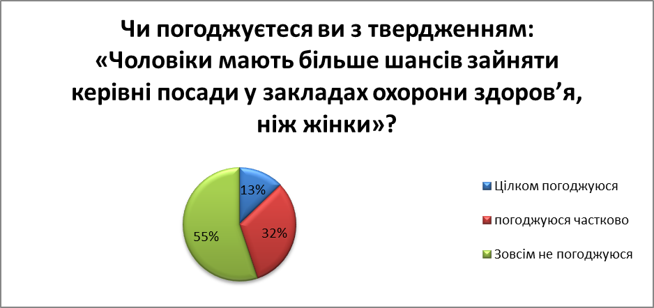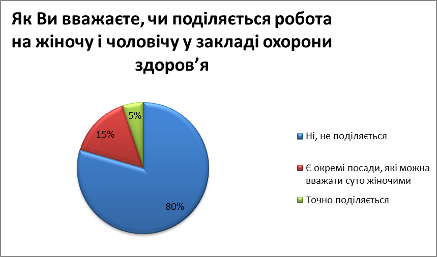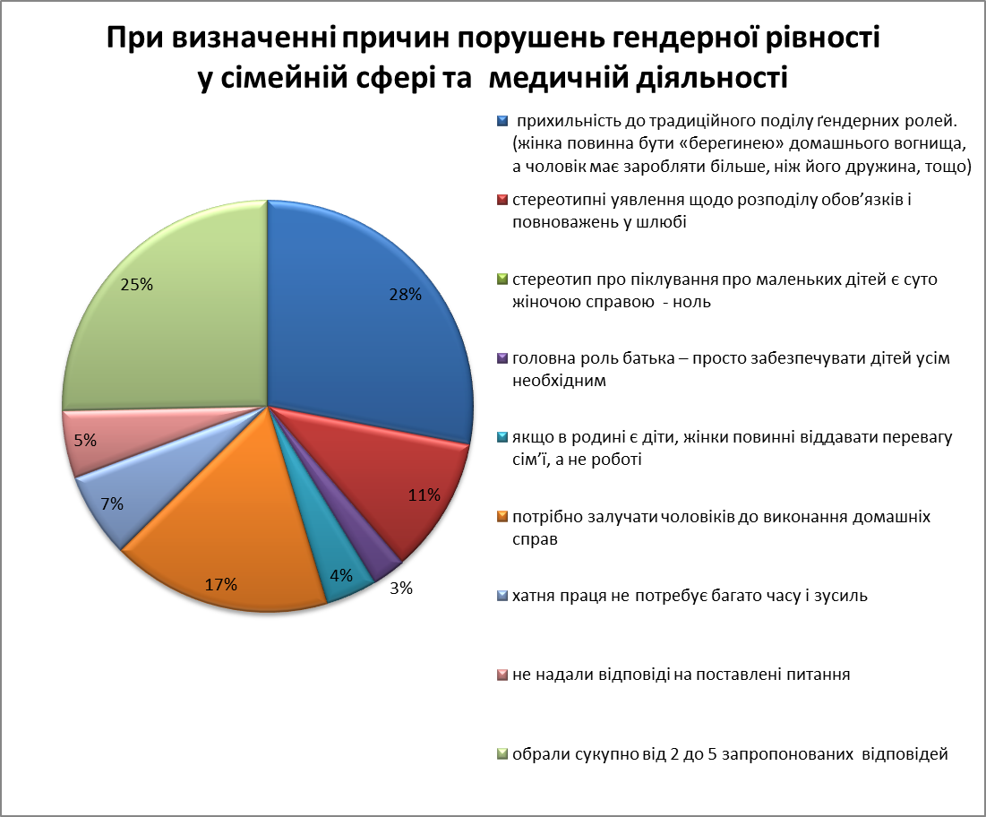 Аналіз відповідей дозволяє зробити висновок, що основною причиною окремих порушень гендерної рівності у сфері охорони здоров’я , на думку опитаних, залишаються застарілі традиції та уявлення про роль і місце жінки та чоловіка у суспільстві загалом та у професійній діяльності зокрема.