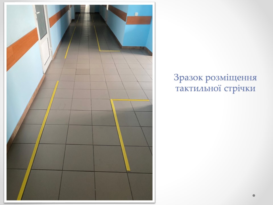 • у коридорах розміщена тактильна стрічка, яка вказує напрямки руху для людей з вадами зору;